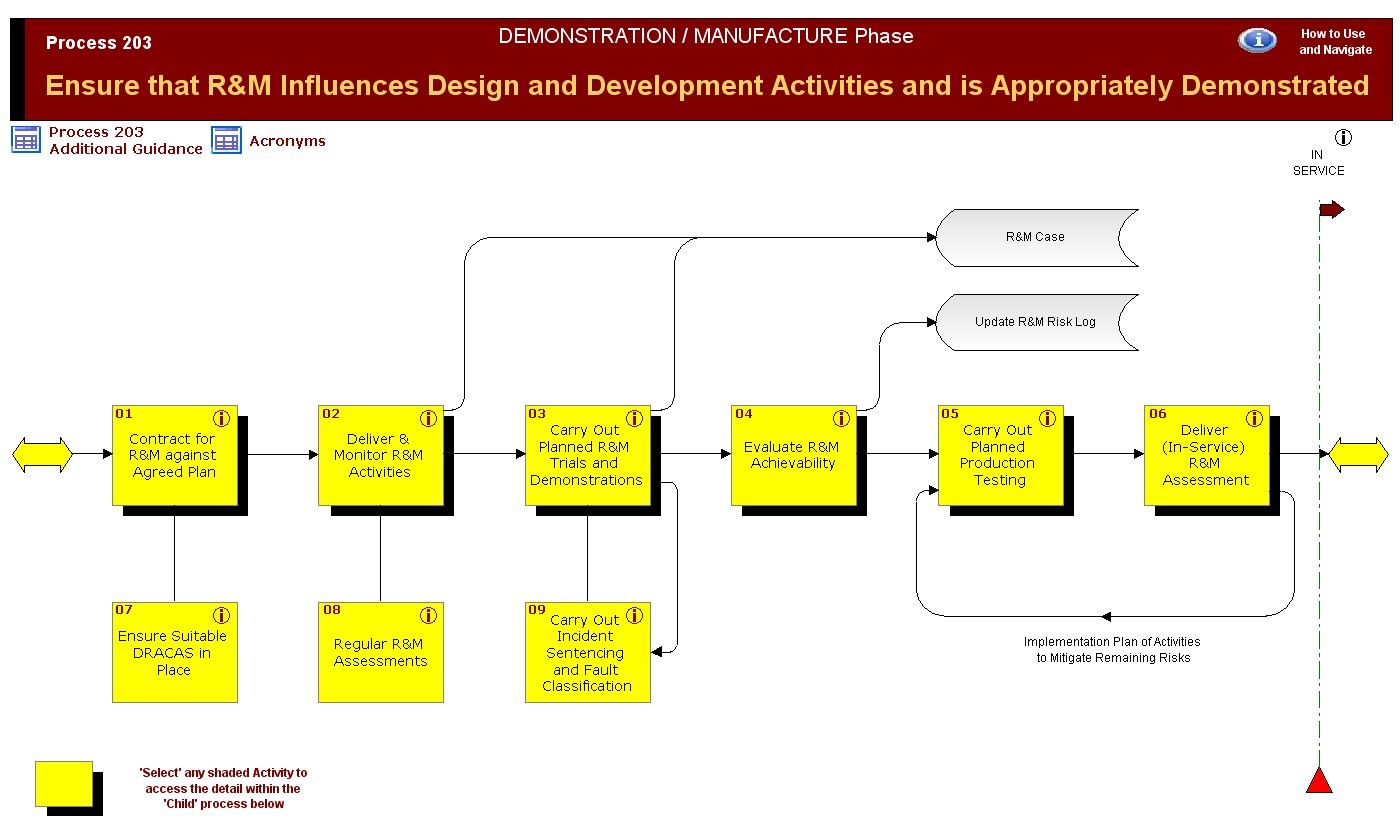 Maintain R&M In-Service Expand & Develop Understanding of R&M Requirement Maintain R&M In-Service Process 203 Acronym List How to Use and Navigate Deliver & Monitor R&M Activities Deliver (In-Service) R&M Assessment Carry Out Planned Production Testing Evaluate R&M Achievability Carry Out Planned R&M Trials and Demonstrations Contract for R&M against Agreed Plan
