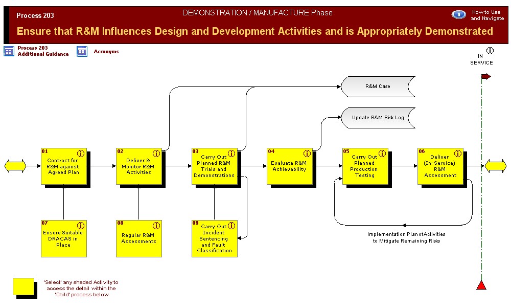 Maintain R&M In-Service Expand & Develop Understanding of R&M Requirement Maintain R&M In-Service Process 203 Acronym List How to Use and Navigate Deliver & Monitor R&M Activities Deliver (In-Service) R&M Assessment Carry Out Planned Production Testing Evaluate R&M Achievability Carry Out Planned R&M Trials and Demonstrations Contract for R&M against Agreed Plan