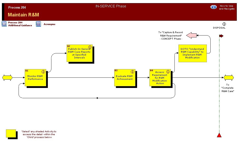Complete andPublishthe R&M Case Complete andPublishthe R&M Case Ensure that R&M Influences Design and Development Activities and is Appropriately Demonstrated Capture and Record R&M Requirement Process 204 Acronym List How to Use and Navigate Assess Requirement for R&M Modification Action Evaluate R&M Achievement Publish In-Service R&M Case Reports at Specified Intervals Monitor R&M Performance